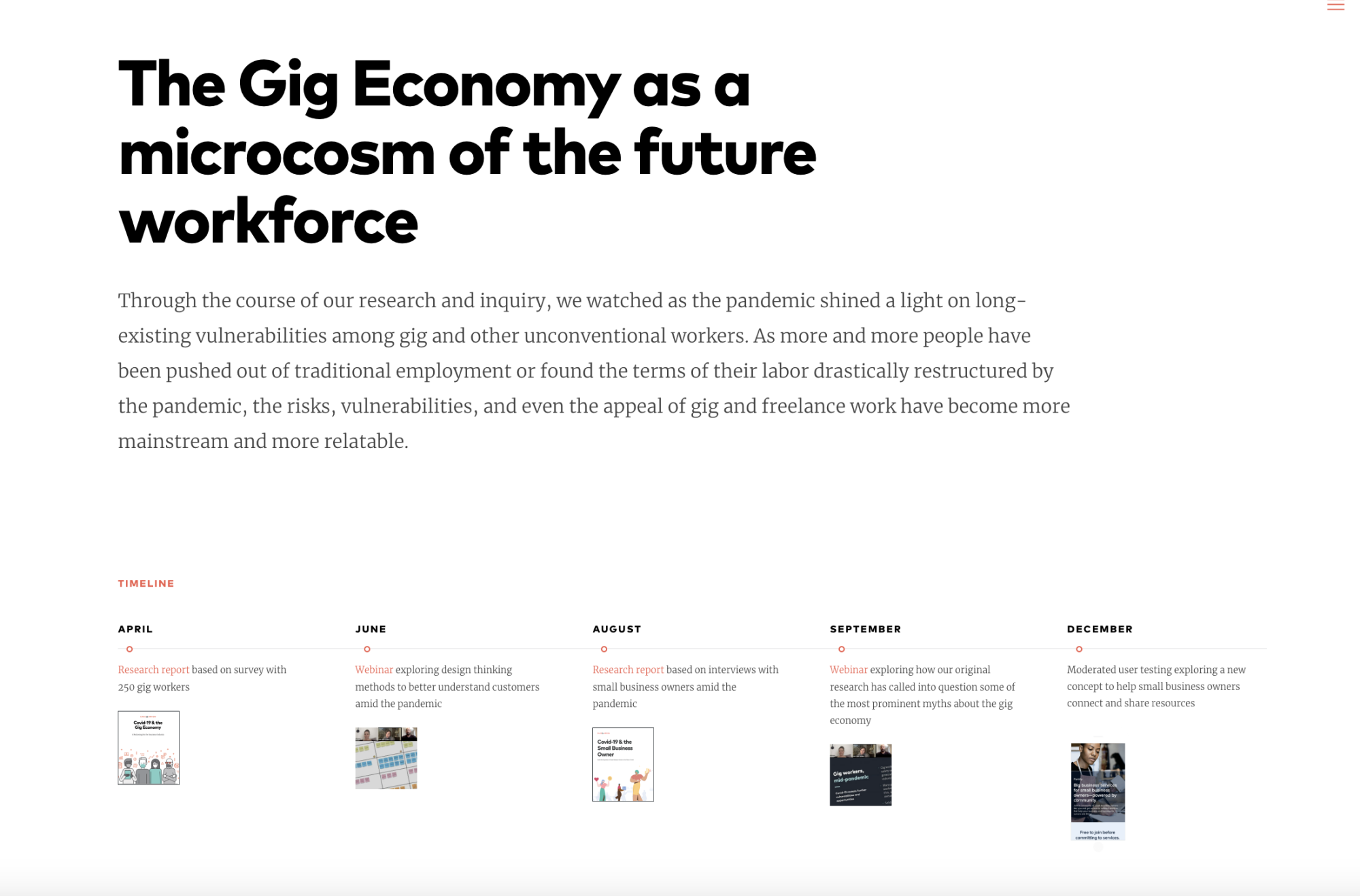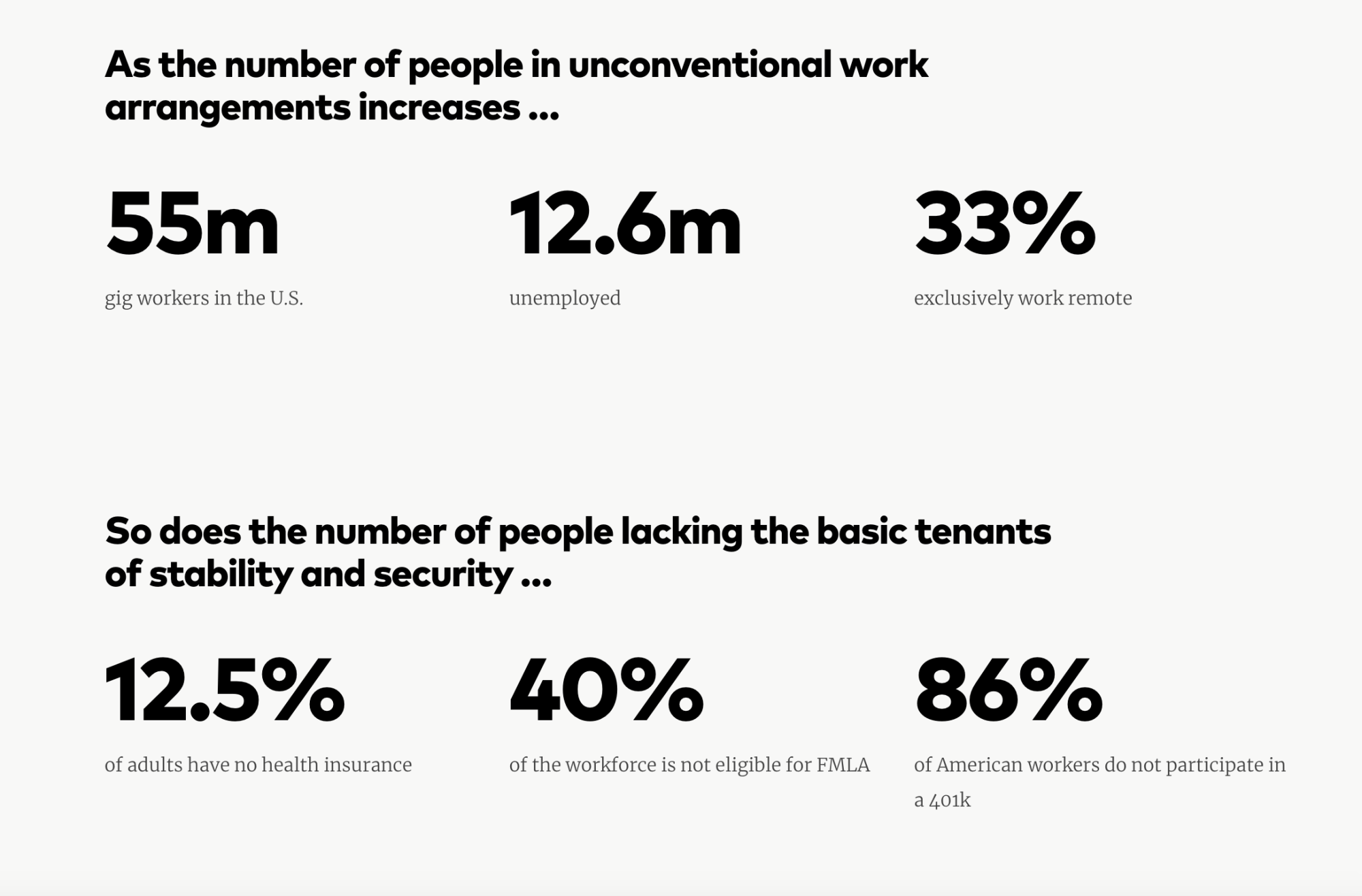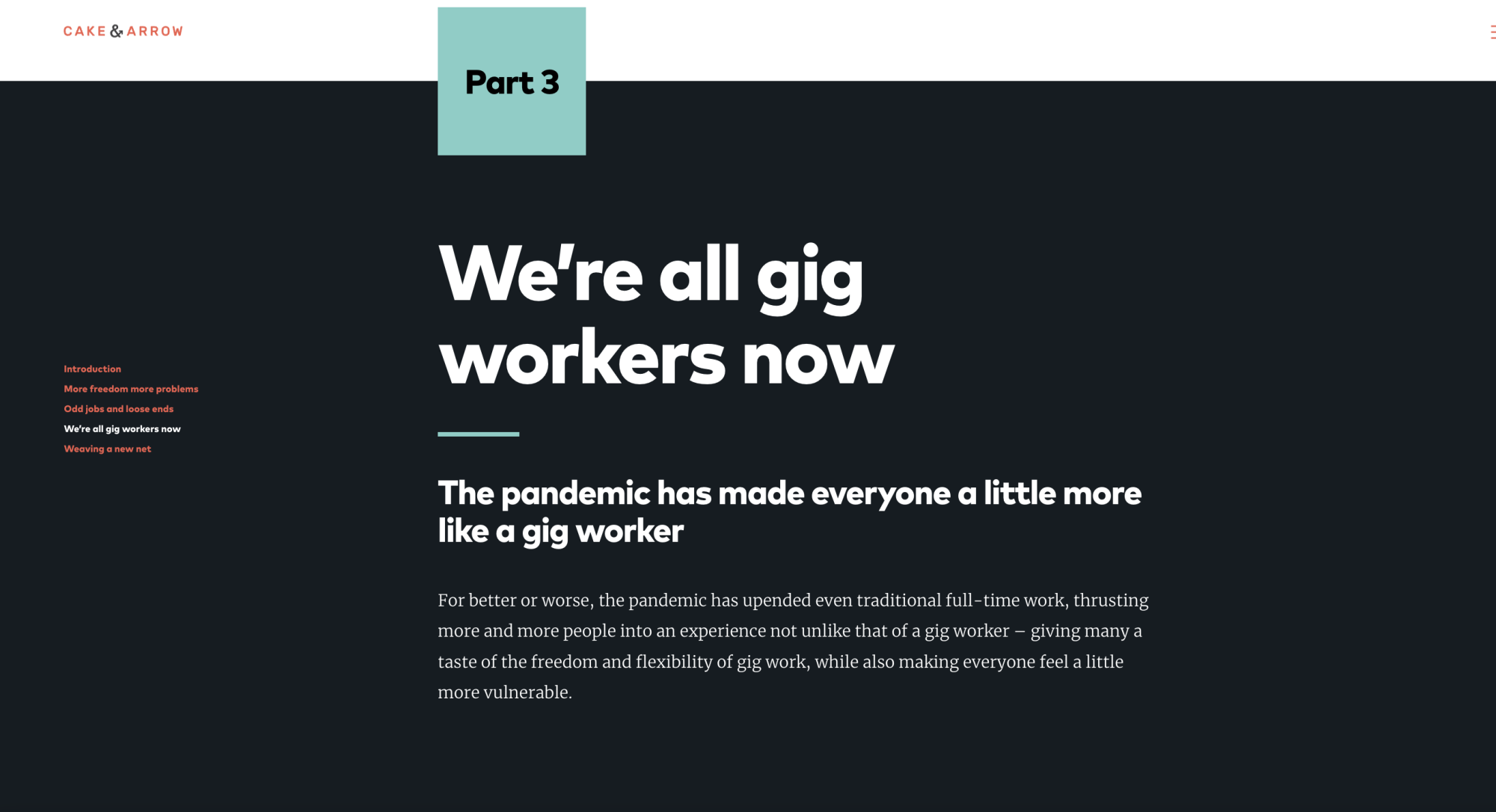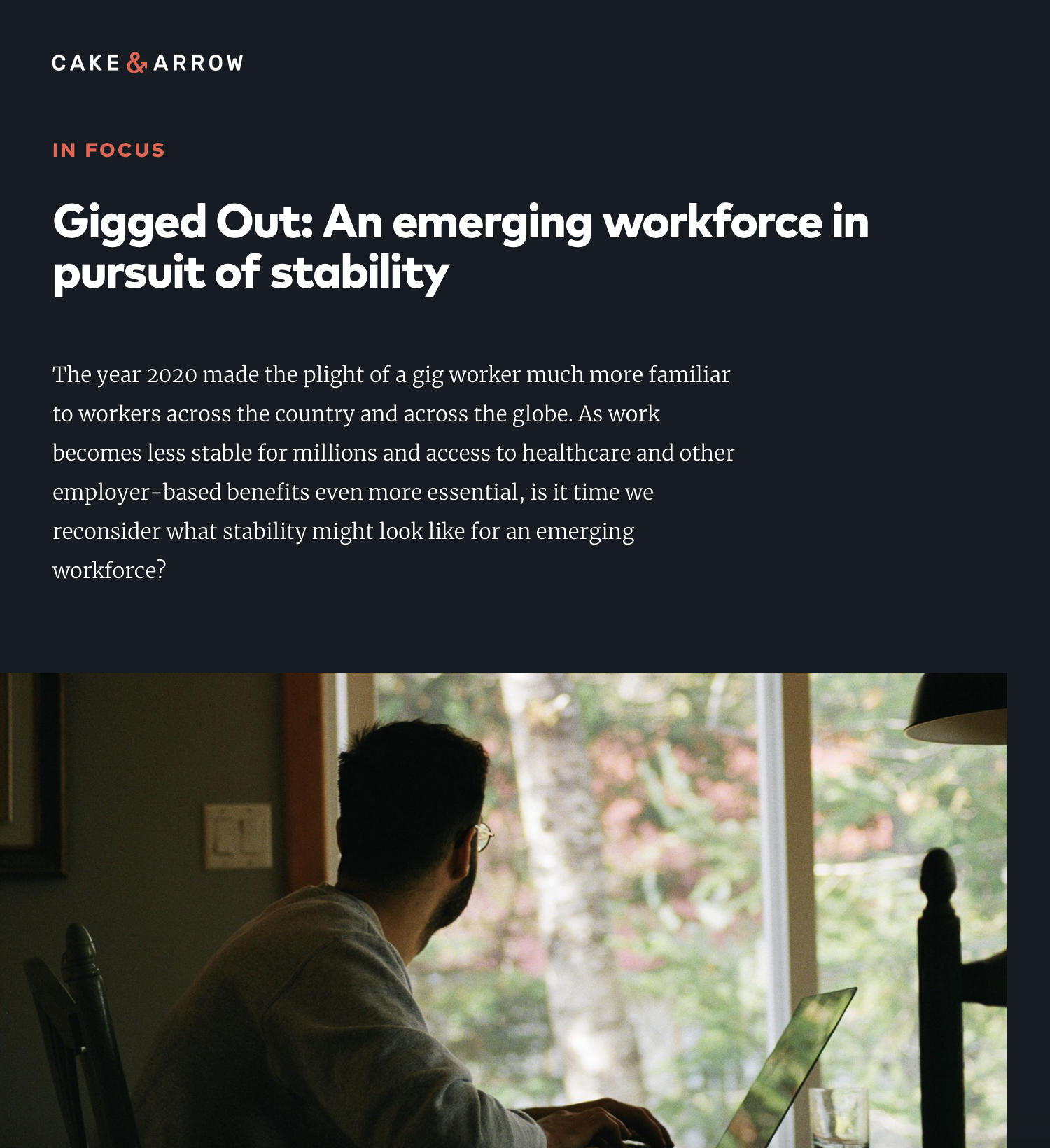 Bringing together several years of research and thought leadership related to gig economy workers, millennials, Covid-19, and small business owners, this editorial was created to establish a unique point of view from Cake & Arrow on how the gig economy might now be viewed as a microcosm of an emerging, post-pandemic workforce, defined by greater vulnerability and instability alongside a desire for more autonomy and flexibility when it comes to work. The piece highlights the research from which this perspective emerged and discusses the implications for the insurance industry.