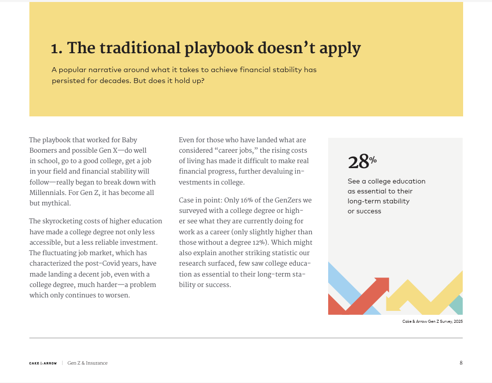This report was designed to explore how Gen Z is approaching financial stability—and what role insurance plays (or doesn’t play) in that journey. Using a mixed methods approach that combined survey data with in-depth interviews, we set out to understand not just what Gen Z is doing financially, but why. The goal was to give insurance leaders deeper insight into the values, behaviors, and expectations shaping this generation—and to identify tangible ways insurers can better meet their needs, both today and in the future.